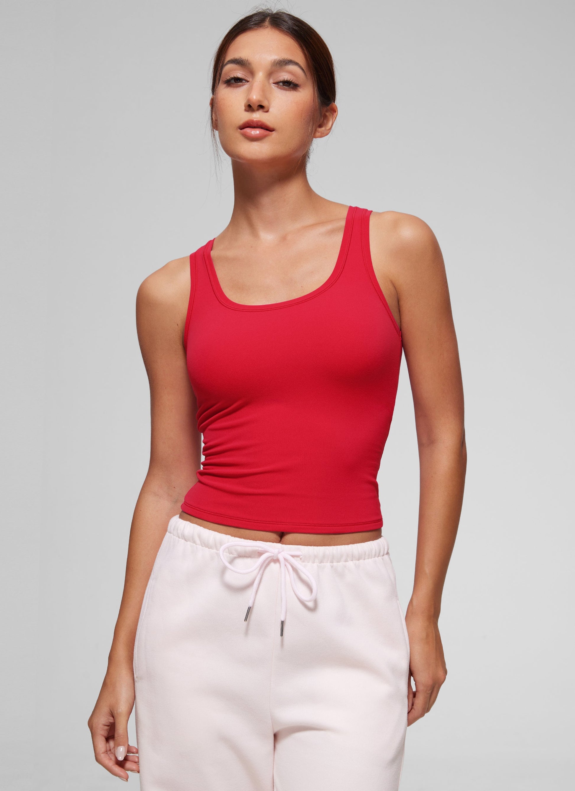 Softembrace collection features soft against skin with stretch and decent support, ideal essentials for everyone. Basic soft tank tops with scoop neck design for comfort wearing and a chic style in everyday outfits. Effortless to match your pairings in different styles.